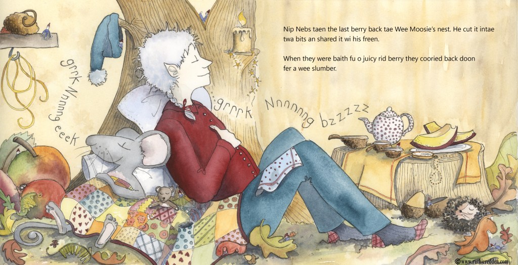 By 2019 Nip Nebs was shortlisted for Bairns Book o the Year at the very first Scots Language Awards and Nip Nebs and the Last Berry was published using Scottish Government funding from the first ever Scots Publishing Grant. We got a special mention in Scottish Parliament during the indigenous languages debate. This year Nip Nebs and The Last Berry was shortlisted for Bairns Book o the Year at the online 2020 Scots Language Awards. The Bairns Book o the Year Scots Language Award winner was Hans Christian Andersen Stories in Scots by various writers including myself. Published by Itchy Coo and edited by Matthew Fitt and James Robertson. True pioneers for writing in Scots for weans.